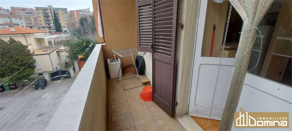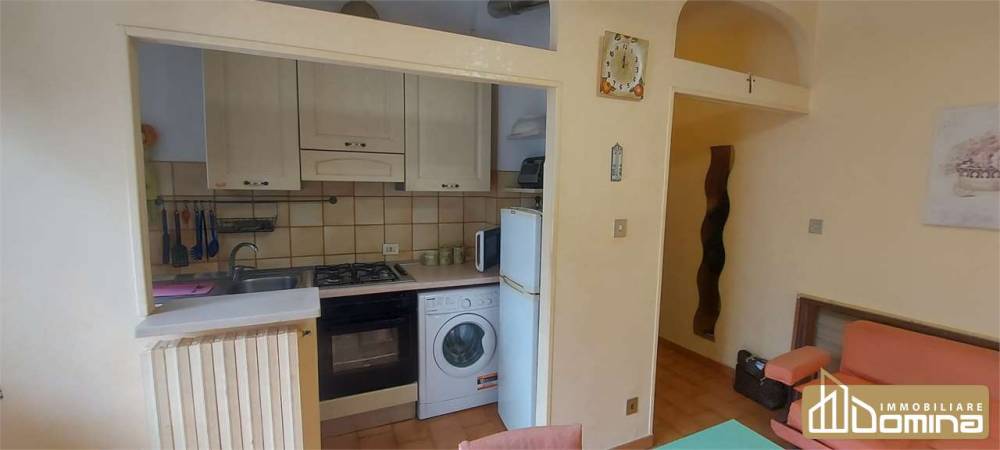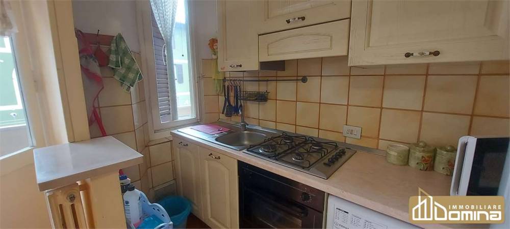 L'immobile si compone di: ingresso nel soggiorno con accesso a balcone, cucinotto, camera matrimoniale con balcone, cameretta, bagno e ripostiglio. Concludono la proprietà una cantina al piano seminterrato e un posto auto assegnato nella corte condominiale con sbarra. L'appartamento in buone condizioni viene ceduto completo di arredo.
