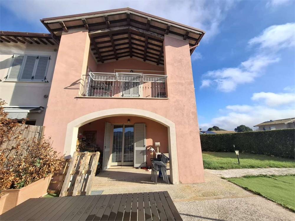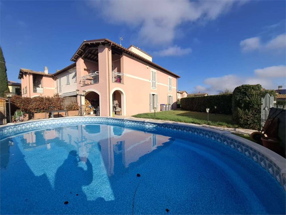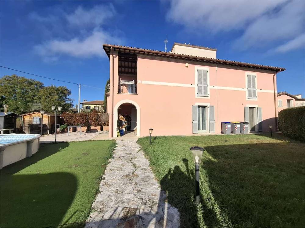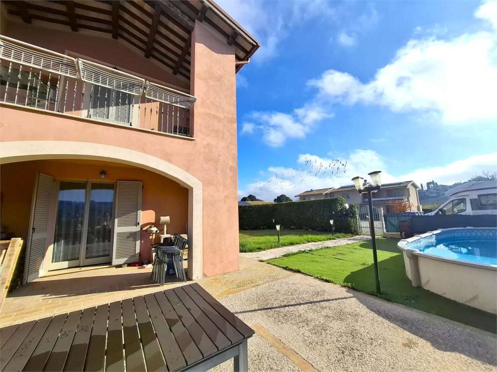 Spoleto, primissima periferia servita e richiesta, disponiamo di una splendida porzione di villa disposta su più livelli. Al piano terra troviamo un ampio salone con accesso al giardino, cucina abitabile e bagno; al piano primo tre camere matrimoniali, un ulteriore bagno e una loggia coperta con affaccio sulle colline circostanti. Soffitta/torretta che puó essere adibita anche a studio al piano secondo. Il piano seminterrato è composto da una spaziosa taverna, un garage doppio e un vano lavanderia. Completa la proprietà un ampio giardino angolare con piscina. A livello tecnologico la casa è fornita di pannello fotovoltaico da 4,5 Kw e pannello solare per acqua calda sanitaria e riscaldamento a pavimento. Split con aria condizionata. L'immobile usufruisce di accumulo di acqua piovana per l'irrigazione del giardino. Nel prezzo di vendita si intende compresa la cucina del piano terra.