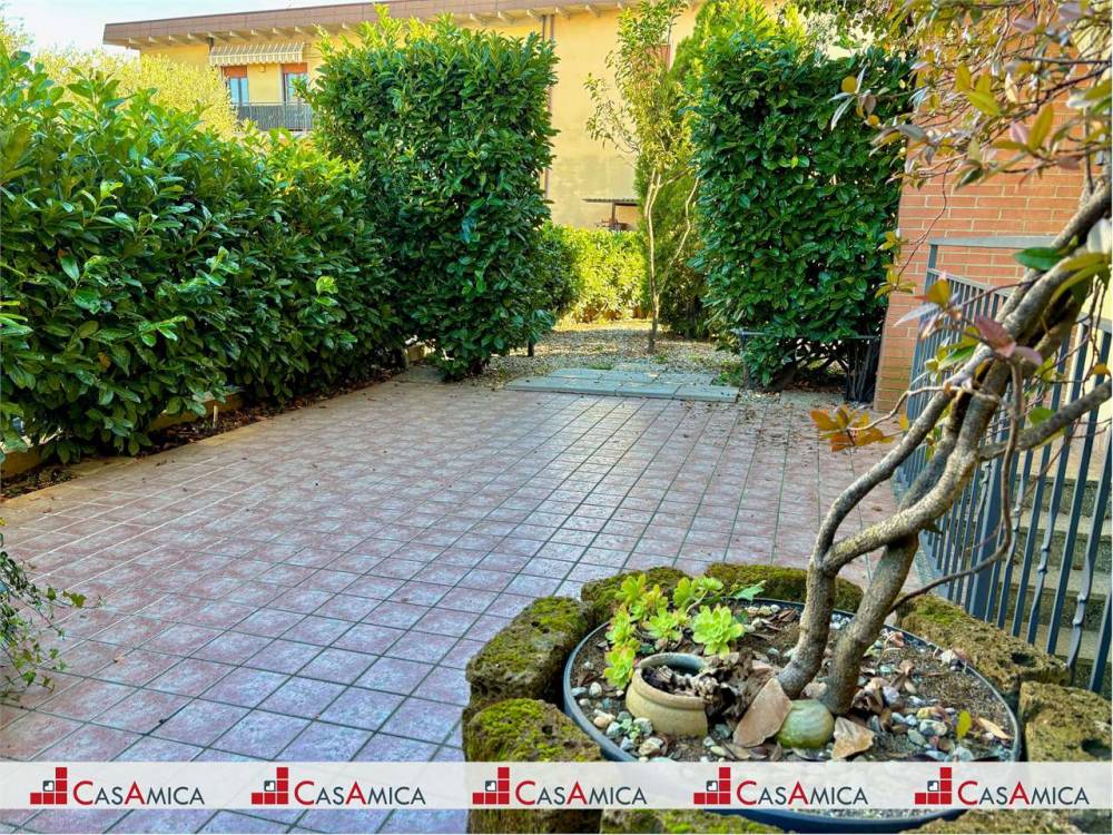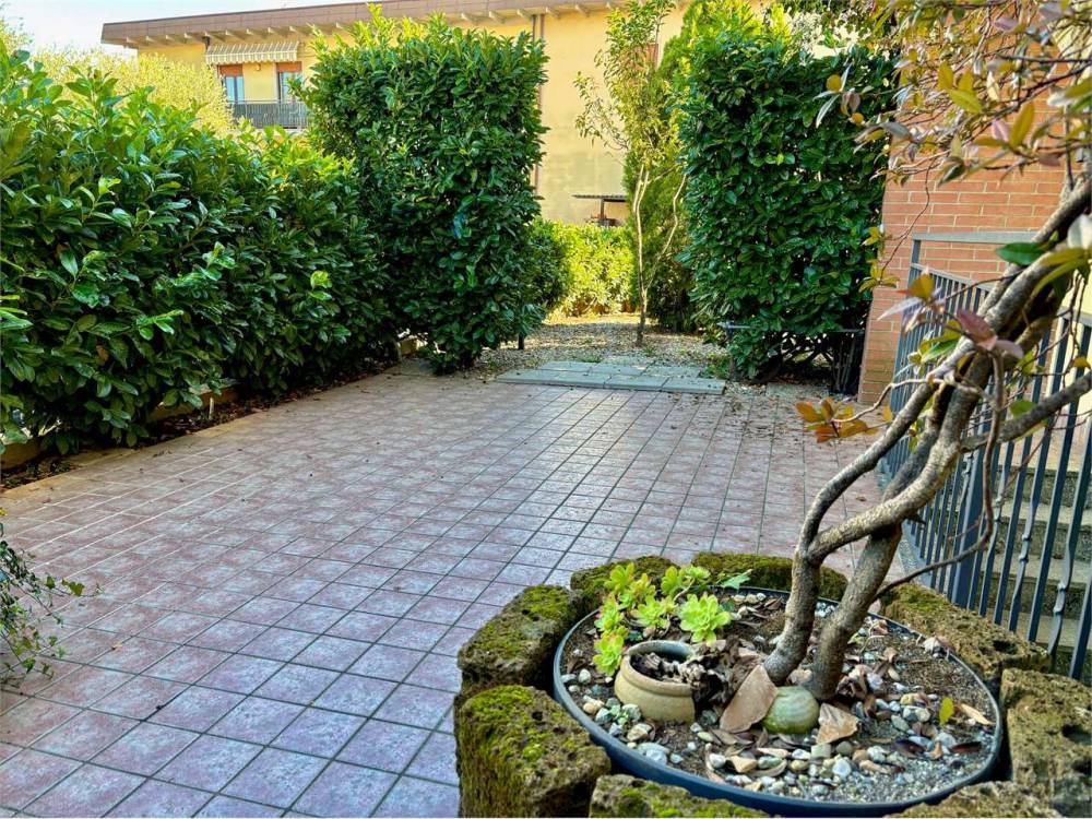 Dal rigoglioso giardino esclusivo si accede direttamente alla scala esterna che porta al piano primo, dove un terrazzo lungo tutta la zona giorno regala spazio e luce, perfetto per colazioni all'aperto o serate estive in relax.