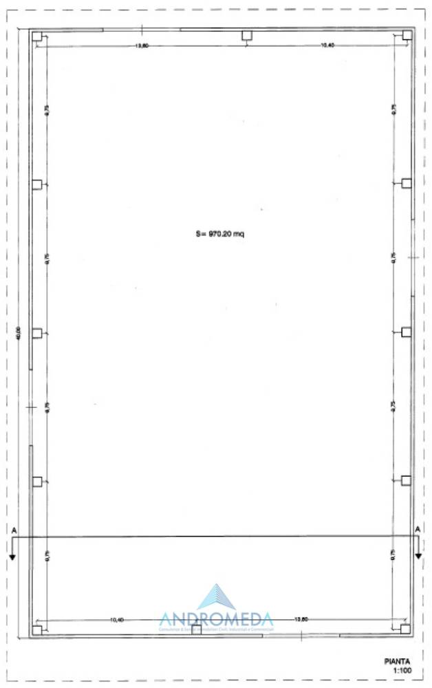 L’immobile è composto da un’area produttiva di circa m² 900, con altezza al colmo di 10,00 m e altezza sotto trave di 8,40 m, e da una zona uffici di circa m² 100.
