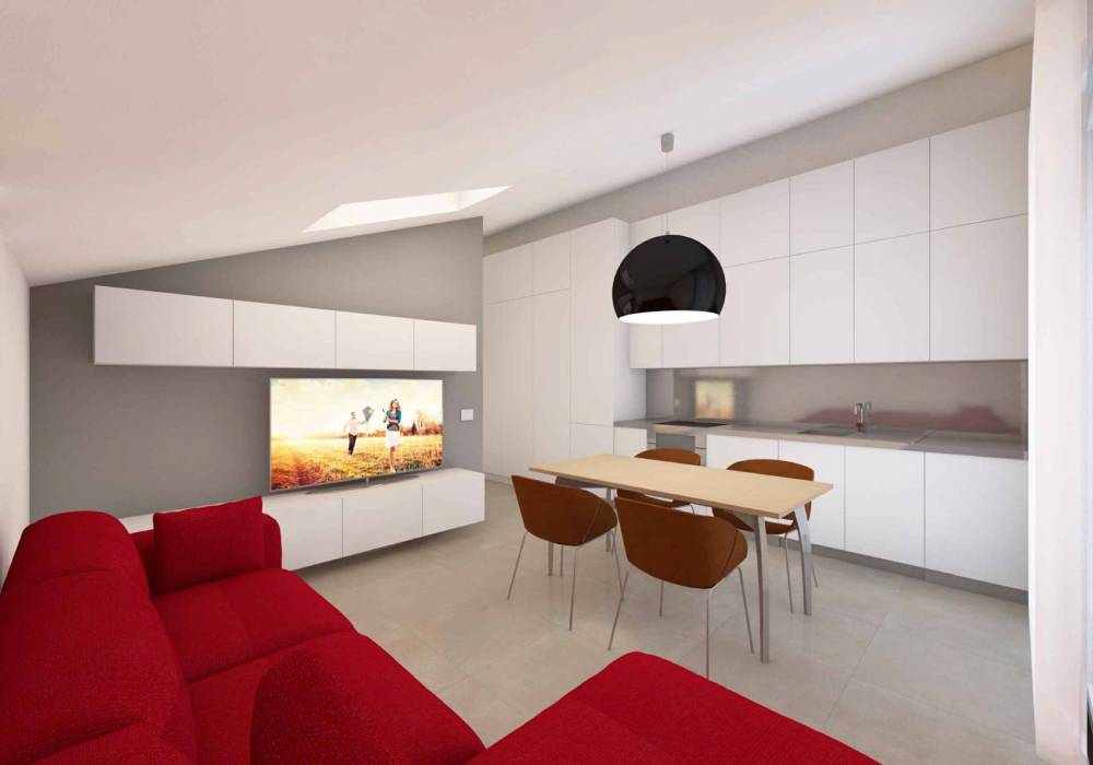 Tipologia C / C1 – SLV 103,13 mq – € 235.000 Ingresso su zona giorno con angolo cottura, disimpegno, 1 camera, 1 bagno, balcone, scala interna per accesso al sottotetto pluriuso (al grezzo), garage e posto auto.