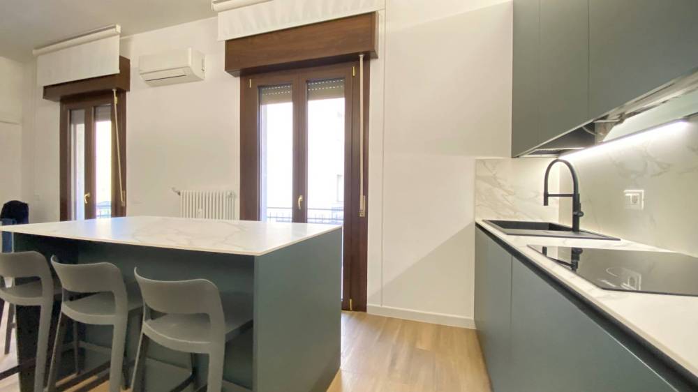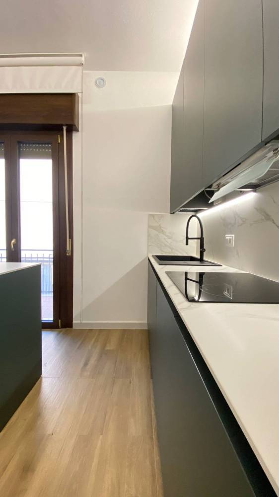 Completamente ristrutturato con ottime finiture, esposizione sud, balcone, bagno finestrato con doccia, cantina e garage.