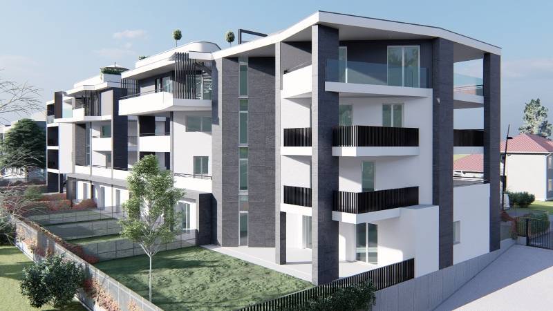L'architettura elegante e moderna è arricchita da una curata scelta del verde, rivestimenti in gres effetto pietra, pannelli frangisole e parapetti in ferro grigio, offrendo soluzioni abitative di grande fascino.