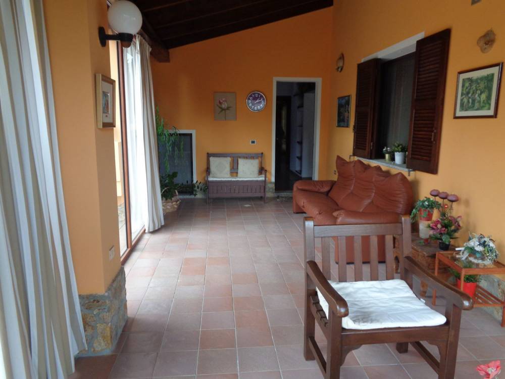 Da qui si accede ad un ampio salone dotato di un camino che aggiunge calore e charme, con attigua sala da pranzo e, adeguata negli spazi, una cucina abitabile che si affaccia per mezzo di una porta finestra, ad un'ampia veranda su lato ovet del giardino.