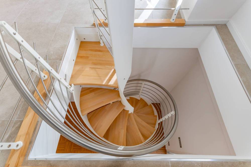 Al centro della stanza si trova una scala elicoidale di design che porta al piano seminterrato, luminoso grazie alla presenza di una finestra a tutta altezza con accesso a un piccolo terrazzino perfetto per momenti di relax.