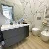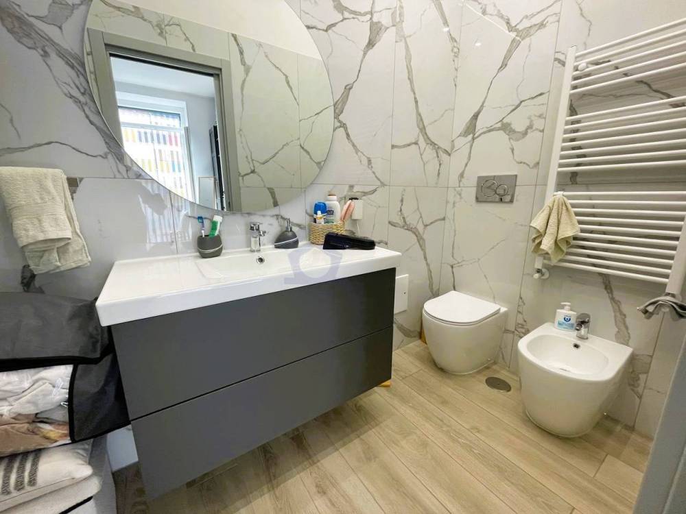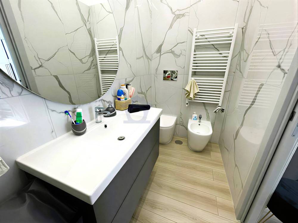 La zona notte offre due camere da letto ben organizzate, tra cui una camera matrimoniale con bagno privato, un dettaglio che aggiunge comfort e praticità alla vita quotidiana. Il secondo bagno, anchesso moderno e rifinito con materiali attuali, completa la funzionalità della zona notte.