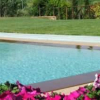 Primo piano: a mezzo di una bellissima scala in pietra, illuminata con luci a led, si accede alla sala colazioni o per cene di altissimo livello; la sala si affaccia sul giardino che è al solito livello dove insiste una grande piscina a raso, incastonata in una terrazza naturale. L'ampia piscina (9x18m) dell'agriturismo è depurata con un sistema innovativo che garantisce la purezza dell'acqua in quasi assenza di cloro. La piscina è aperta da maggio ad ottobre ed è illuminata anche di notte.