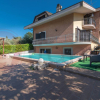 Al piano sottostante l'ingresso troviamo un ampia sala con cucina rustica in muratura e camino a parete, servizio e accesso diretto alla piscina. Un'ampia area relax con divani e portico in legno abbraccia la piscina, vero e proprio plus durante la stagione estiva.
