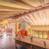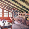 L'elegante soppalco si affaccia sul soggiorno a doppia altezza e ospita una gradevole zona conversazione con libreria in legno realizzata su misura e perfettamente integrata al sistema di travi a vista presente in tutta la zona giorno.