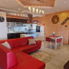 Von der einladenden Veranda mit Panoramablick betreten Sie die Wohnung im Hochparterre, die einen großen Wohnbereich beherbergt, der aus einem Wohnzimmer mit Küchenzeile und einem modernen Kamin besteht.