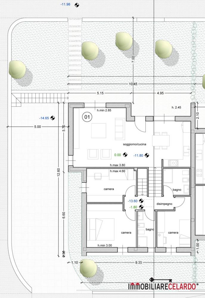 Al piano terra, soggiorno/cucina, una camera matrimoniale, due camere singole, due bagni, per un totale di mq 115, e resede esclusivo di mq 210.