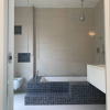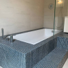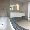 Bagno elegante con sanitari sospesi, vasca con gradino, inserti in mosaico e rubinetteria di design Gessi