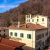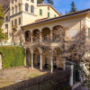 Il loggiato del secondo piano, con le sue colonne e archi policentrici, offre una vista panoramica sulle montagne e sul verde circostante.