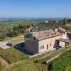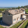 Labitazione principale si sviluppa su tre livelli. Al piano terra si apre una luminosa zona giorno con tre grandi vetrate affacciate sul portico e sulla piscina, offrendo una vista impareggiabile sul paesaggio collinare e sul mare Adriatico. La cucina abitabile è pavimentata con cotto fatto a mano e predisposta per linserimento di unisola centrale, con accesso diretto al porticato posteriore. Sempre al piano terra si trovano anche un ampio soggiorno in cotto con riquadro in vetro a pavimento, che illumina naturalmente il piano interrato, e un elegante bagno in marmo opaco giallo-ocra con doccia doppia in vetro.