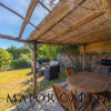 Una veranda coperta con grandi vetrate e una terrazza coperta incannucciato completano la zona esterna.