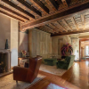 Il primo piano, raggiungibile tramite scala in marmo o ascensore, offre ampi spazi per convivialità e relax, tra cui un salone di accoglienza con soffitto a travi a vista sbiancate, una cucina/sala da pranzo suddivisa in due aree, tre saloni pavimentati in pregiato parquet pali di Venezia a motivo geometrico e impreziositi da affreschi originali riconducibili al 1500/1600; imponenti camini in marmo e soffitti a cassettoni decorati dal tocco barocco, oltre a una sala/studio anchessa impreziosita da raffinati affreschi e soffitto a cassettoni. I saloni affacciano su loggiati vivibili che dominano la corte interna. Completano il piano, due bagni che servono i saloni.