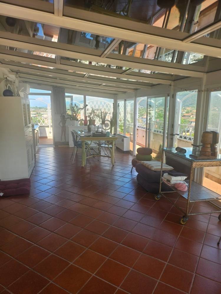 E' composto da cucina abitabile, sala pranzo panoramica, 2 camere matrimoniali, 1 bagno con idromassaggio ,1 con doccia, studio lettura , terrazza grande su tre lati panoramici .