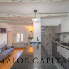Lingresso si apre su unampia zona living luminosa, impreziosita da travi in legno a vista con finitura decapata, che conferiscono allappartamento uno stile shabby chic. Il parquet naturale dona calore e armonia allambiente, mentre il camino angolare in muratura con vetro frontale diventa un elemento centrale dellambiente, perfetto per creare unatmosfera calda e accogliente nelle serate invernali. Dalla zona living si accede a una comoda terrazza con affaccio sul centro cittadino, ideale per colazioni allaperto, momenti di lettura o per accogliere gli ospiti in un contesto riservato. La cucina a vista si distingue per uno stile industriale-contemporaneo: pensili effetto cemento, basi grigio scuro e una parete decorata con piastrelle tipo cementine dai toni del grigio, che donano ritmo e personalità. Da qui si accede a una seconda terrazzina, perfetta da adibire a zona lavanderia o ripostiglio esterno.