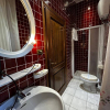 Infine, il bagno moderno e rifinito, completo di ogni comfort, dispone di un ampio box doccia, servizi e un lavabo, con rivestimenti in ceramica rossa lucida che donano un tocco di modernità ed eleganza.