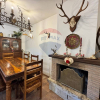 Dalla cucina, dalle linee semplici e moderne, si accede direttamente all'ampio e luminoso soggiorno: il pavimento in cotto e larredamento in legno contribuiscono a creare unatmosfera semplice e familiare. Cuore del soggiorno, però, è senza dubbio il camino a legna, in muratura e con cornice in mattoni e mensola in legno grezzo. La parete è impreziosita da corna di cervo che, richiamando limmaginario delle baite, diventano veri e propri elementi darredo, contribuendo a rafforzare il legame tra la casa e lambiente naturale che la circonda.