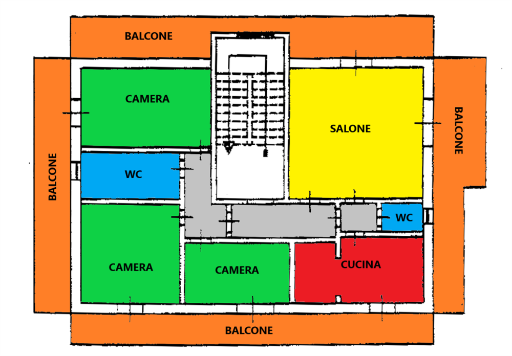 Ingresso, ampio salone, tre camere da letto, due bagni, quattro balconi con vista aperta.