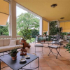 La villa è corredata da giardino completamente recintato di circa 800 mq e da un elegante portico pavimentato di 70 mq posto sotto la terrazza, ben organizzato per rilassarsi o cenare all'aperto e dotato di tende parasole.