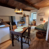 Zona giorno con divano, stufa a legna, angolo cottura con 2 piastre a induzione, forno elettrico, frigorifero con freezer