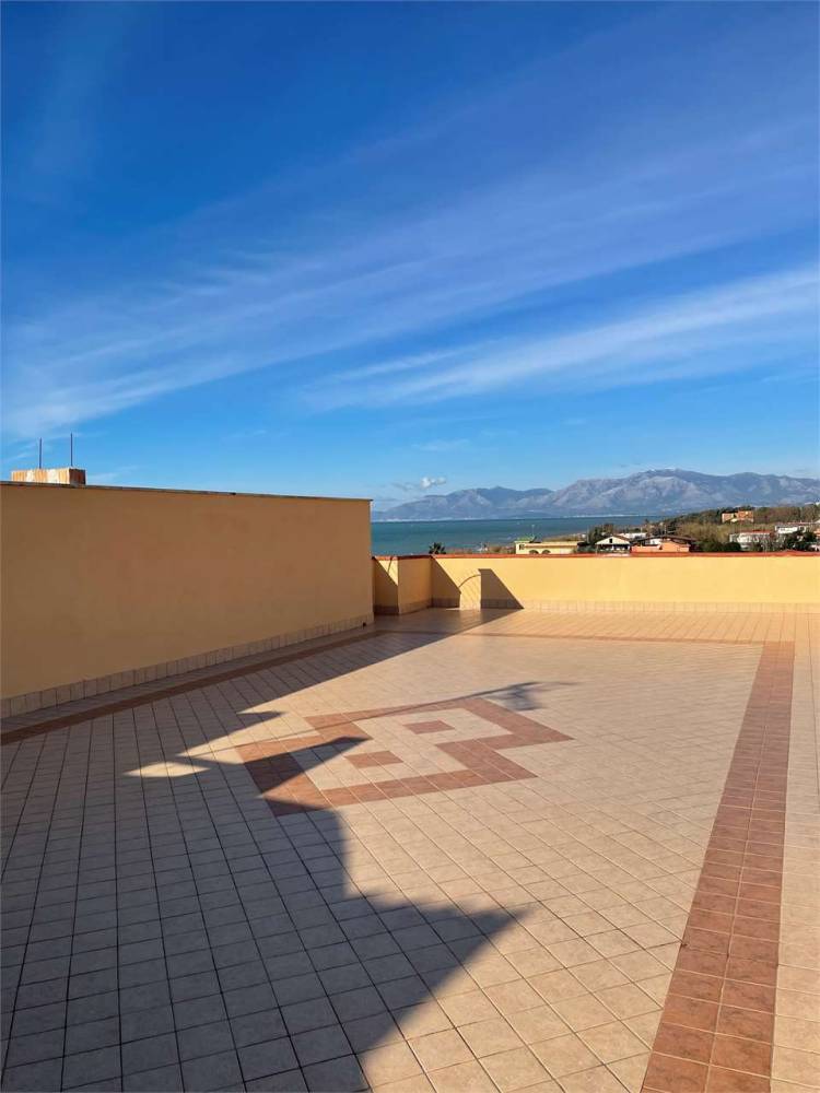 Attico posto al piano terzo, composto da ingresso con ampio soggiorno e cucina abitabile, due grandi camere matrimoniali e un bagno patronale; ampia balconata vista mare ed al piano superiore lastrico di proprietà esclusiva con terrazzo panoramicissimo prima fila sul mare pavimentato, praticabile e calpestabile di circa 100 mq, ottime rifiniture, recentemente ristrutturato, in ottime condizioni, pronto all'uso, ideale per le vacanze; locale garage di 25 mq circa oltre posto auto interno scoperto assegnato.
