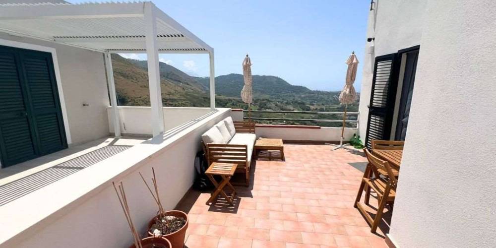 Esternamente, la villa è impreziosita da una splendida terrazza panoramica con vista mare e monti, ideale per momenti di relax all'aperto.