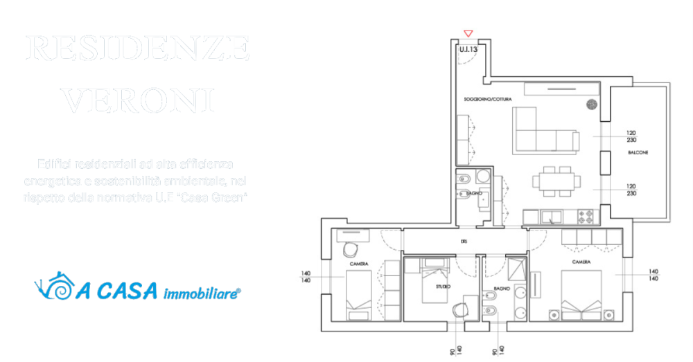 Al piano primo proponiamo in vendita un elegante quadrilocale composto da zona cucina-soggiorno, due camere e uno studio/camera, due bagni e balcone di mq 13, per un totale di mq 115