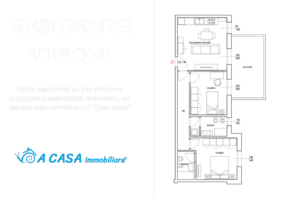 Al piano primo proponiamo in vendita trilocale , composto da zona giorno-cucina, 2 camere, 2 bagni e balcone di mq 17, per un totale di mq 101mq.