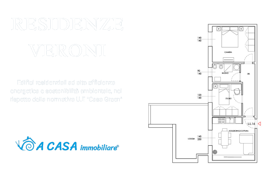 Al piano primo proponiamo in vendita trilocale composto da soggiorno con angolo cottura affacciato su ampia loggia, una camera matrimoniale, un bagno ed una cameretta/studio.