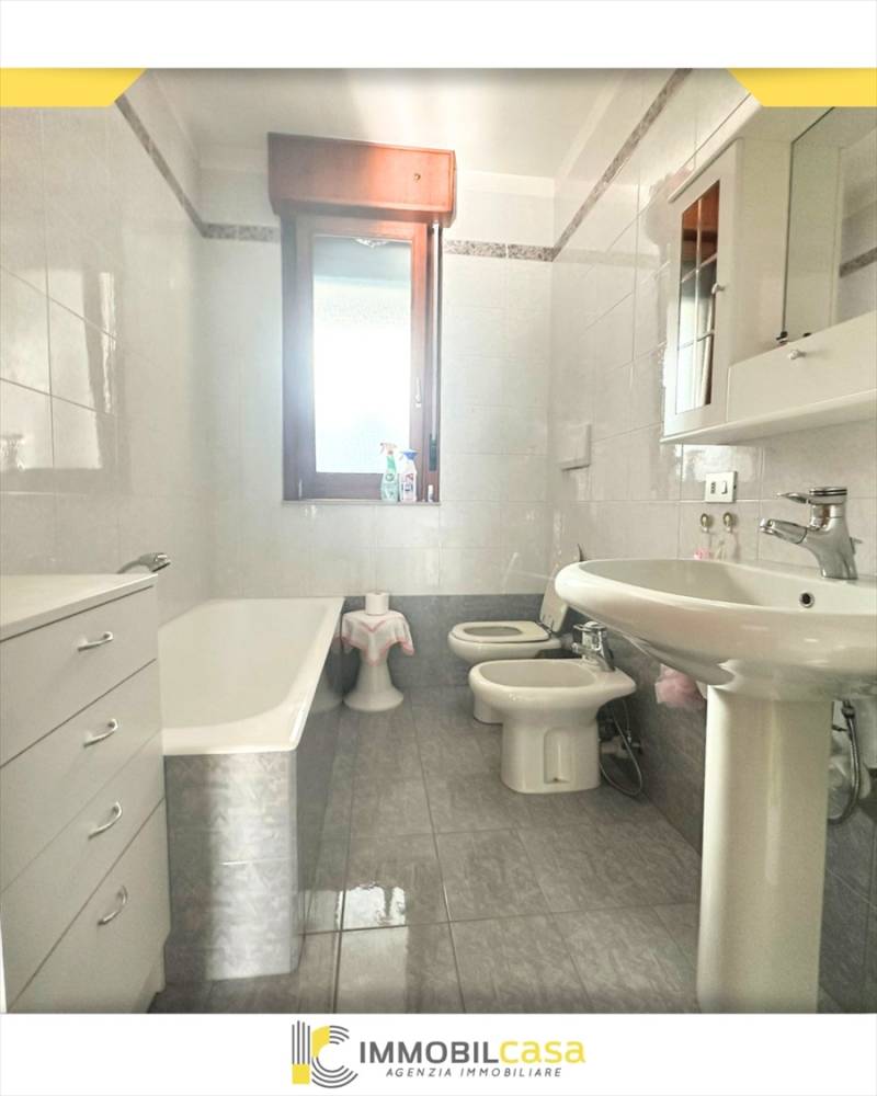 L'appartamento dispone di due bagni entrambi finestrati, uno nella zona giorno e uno nella zona notte dove hanno spazio anche le tre camere da letto, anch'esse con finestra, una con affaccio nella veranda e le altre due con affaccio in un atrio aperto.