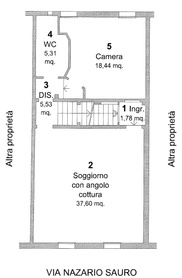 Unità al piano secondo e terzo ( sottotetto) di un più ampio edificio condominiale e formato da ingresso, soggiorno con angolo cottura, camera, bagno e disimpegno al piano secondo, oltre sottotetto costituito da un unico grande vano al piano terzo.