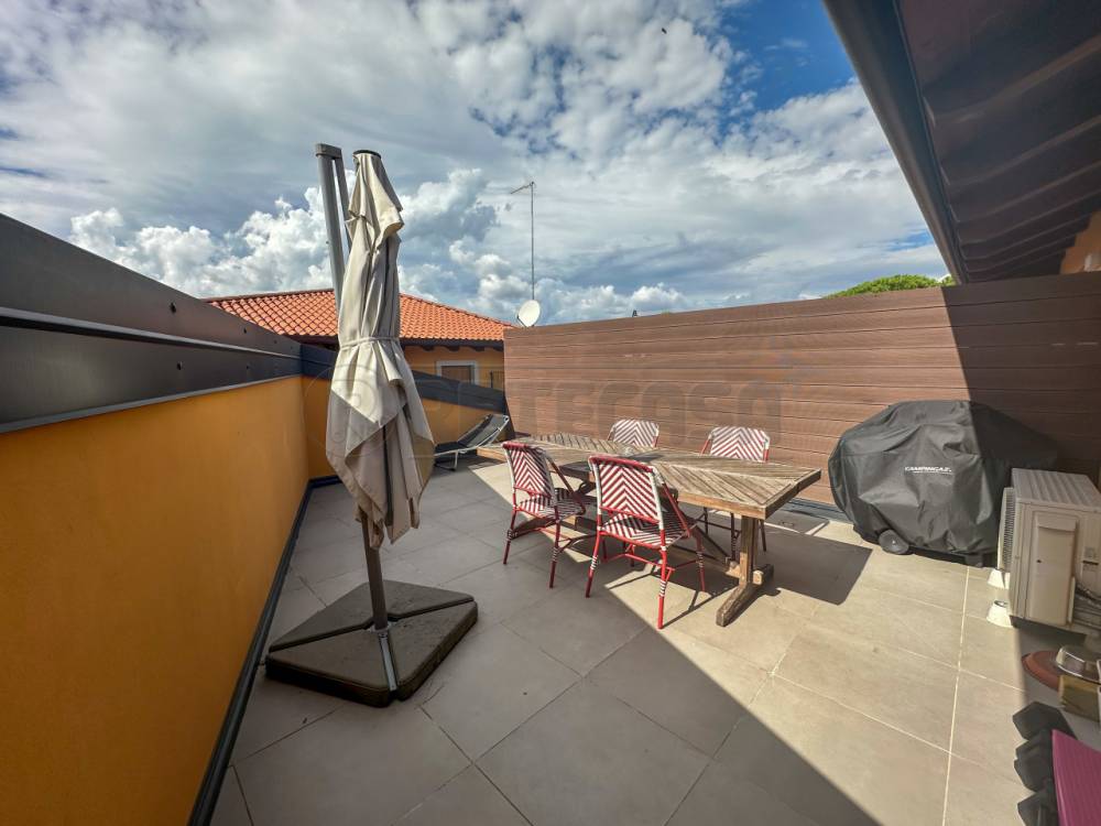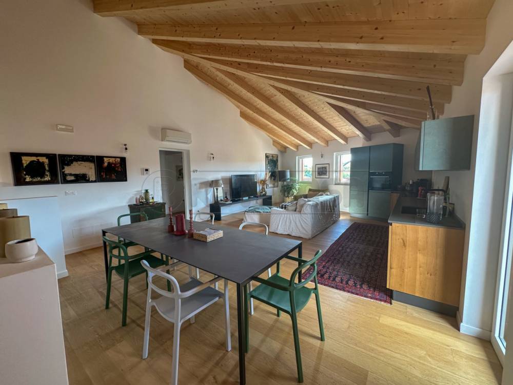 PALMANOVA, dentro le mura: OCCASIONE UNICA ED IRRIPETIBILE! Finalmente a Palmanova, ti proponiamo un appartamento di recente costruzione in una palazzina, composta in totale da 9 unità con due ingressi autonomi di cui uno privato tramite ascensore e uno pedonale per le persone esterne. Le finiture sono moderne e raffinate, con serramenti e tetto in legno con travi a vista. L'appartamento in questione si sviluppa su due livelli nel quale al primo piano troviamo l'ingresso con il vano scale, ottimo per la raccolta dei cappotti e al secondo piano tutta la parte abitativa così distribuita: ampia e luminosa zona giorno con cucina a vista e uscita sulla terrazza privata e recintata che permette di prendere il sole in totale privacy oppure di cenare all'esterno con gli amici; dal disimpegno, che ci conduce alla zona notte, troviamo un piccolo bagno di servizio con doccia, una prima camera da letto, la seconda camera attualmente adibita a cabina armadio e una terza camera matrimoniale servite da un secondo bagno spazioso con doccia. Al piano interrato, accessibile direttamente dall'ascensore, abbiamo un posto auto coperto di proprietà. Perfetto per chi cerca casa solo ed esclusivamente dentro le mura, ma soprattutto per chi vuole una soluzione abitativa diversa da quelle che si trovano solitamente sul mercato. Non aspettare oltre, chiama subito in agenzia per prenotare il tuo appuntamento! La descrizione dell’immobile, la planimetria riqualificata e le metrature riportate non costituiscono elementi contrattuali ma sono solo indicativi.