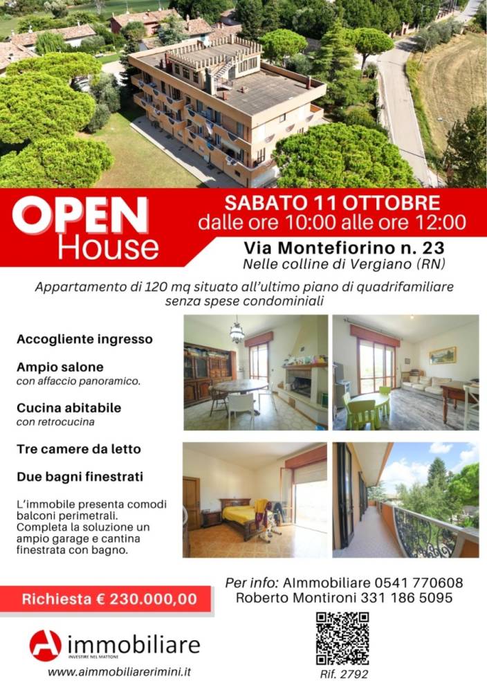 L'agenzia AIMMOBILIARE vende APPARTAMENTO PANORAMICO CON TRE CAMERE E GIARDINO A VERGIANO. La tranquillità delle colline, a pochi minuti dal cuore di Rimini In posizione esclusiva a Vergiano, proponiamo in vendita un appartamento spazioso e luminosissimo, perfetto per chi desidera indipendenza, natura e una vista che lascia senza fiato. Perché sceglierlo: Ultimo piano in quadrifamiliare: solo 4 unità, nessun amministratore e zero spese condominiali. Panorama unico: affaccio sulle colline, sulla città e scorcio mare. Luce naturale tutto il giorno: esposizione ideale. Ampio giardino condominiale alberato: uno spazio verde per relax, giochi e convivialità. Balconi perimetrali vivibili: perfetti per pranzi e cene all’aperto. Gli spazi interni: Ingresso accogliente Grande salone con affaccio panoramico Cucina abitabile con retrocucina Tre camere da letto comode Due bagni finestrati Comodità al piano terra: Garage ampio (altezza 3 m) Cantina finestrata con bagno: ideale come studio, lavanderia o zona hobby Posizione strategica per la famiglia: Fermata autobus a 100 m Servizio scuolabus a soli 50 m Superficie commerciale: 176,5 m² Superficie interna: 120 m² Riscaldamento autonomo a gas Box doppio Posto auto ✨ Un’occasione rara: comfort, indipendenza e natura… senza rinunciare alla città. Rif Aim 2792 Vieni a visitare questo immobile durante l'evento Open House organizzato il giorno sabato 11 ottobre ottobre dalle ore 10:00 alle ore 12:00! Contattaci subito per fissare una visita! Roberto Montironi 331 1865095 - 0541 770608 - rimini@immobiliareromagna.it