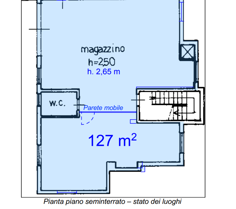 L'immobile è costituito da un ampio locale suddiviso in due ambienti e con un wc finestrato.