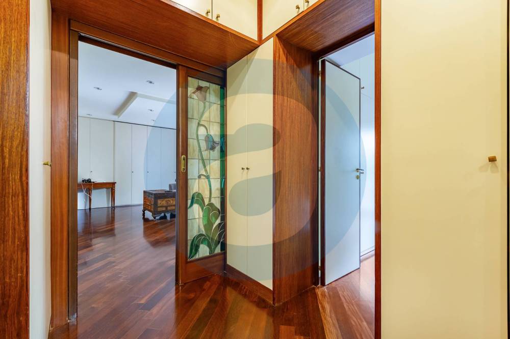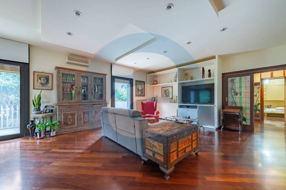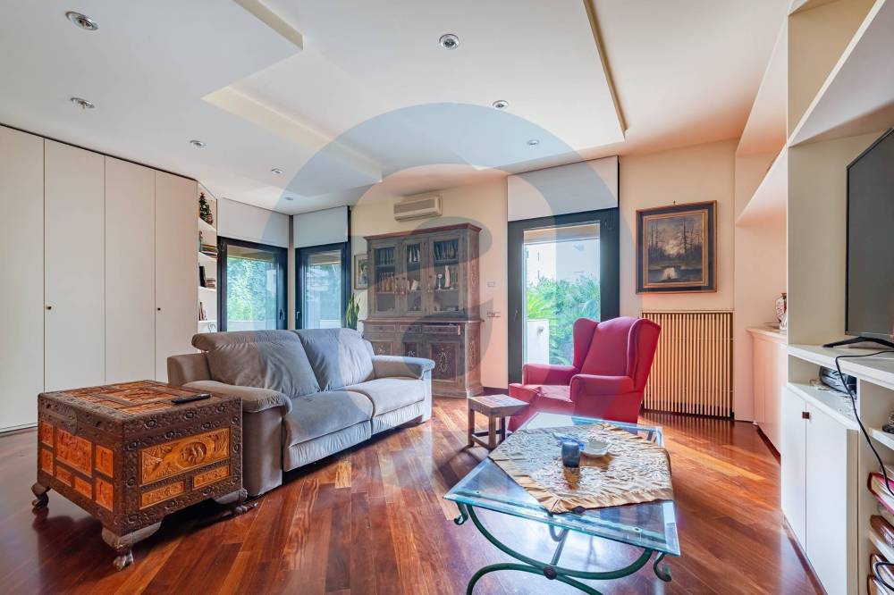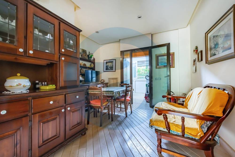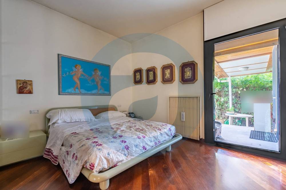 ESTERNO: Appartamento al piano rialzato in un edificio di otto piani, dotato di ascensore. Superficie esterna di 250 mq composta in parte da giardino e in parte da area coperta da tettoia regolarmente autorizzata. Cantina di 8 mq a piano interrato. Oltre al doppio ingresso da pianerottolo è presente un ingresso autonomo, direttamente dal giardino.