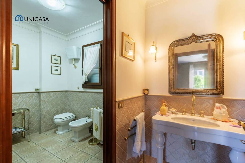 CERVETERI Unicasa Immobiliare offers for sale an elegant detached villa in a private residential complex, centrally located. The four-story villa comprises: the ground floor comprises an entrance hall leading to a double living room with a fireplace and wood paneling, a large study with a window (possible ground-floor bedroom), a hallway, a guest bathroom, another double living room with a fireplace, and an eat-in kitchen, all with direct access to the garden surrounding the property; the first floor comprises two double bedrooms, each with a walk-in closet (originally a children's bedroom), and a private bathroom, one with a Teuco hydromassage tub and sauna, and the other with a Teuco hydromassage shower; the second floor comprises two bedrooms with spacious built-in closets, and a bathroom with shower and window; the basement comprises a 95 sq m hobby room with an open-plan kitchen, a guest bathroom, a laundry room, and a gym with a bathroom and dressing room. The floor is surrounded by a cavity wall that allows for insulation. The property includes two garages with both internal and external access.