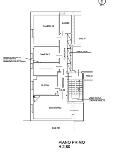 L'appartamento è posto al piano primo, è composto da: ingresso, soggiorno, cucina, corridoio, due camere, ripostiglio, bagno e balcone, oltre a ripostiglio al piano terra.