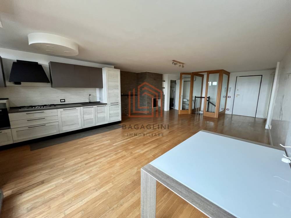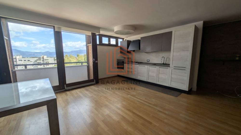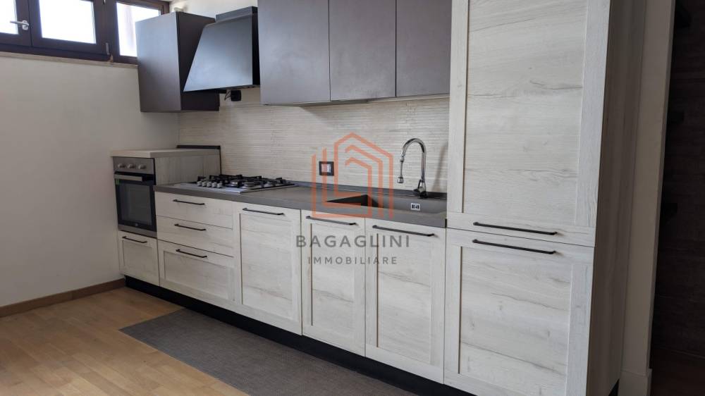 La cucina a vista, moderna e funzionale, si integra perfettamente con la zona living.
