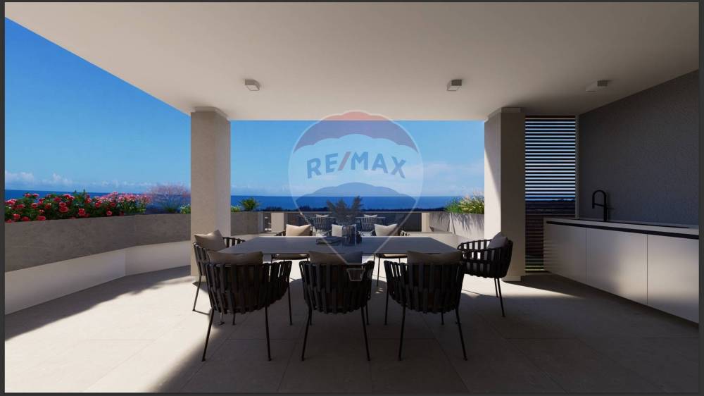Attico di mq 80 coperti con ampia zona living dotata di ampie vetrate con bellissima vista sul lato mare e bosco. Due camere da letto e doppi servizi con ampi terrazzi di 55 mq.