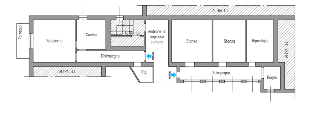 Al piano seminterrato si trova un vano deposito/ripostiglio in comune con le altre proprietà dell'edificio, con una superficie netta di circa 29 mq.
