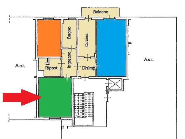 Tipo di appartamento: camera privata in appartamento in condivisione. La camera locata è quella rappresentata in verde sulla planimetria.