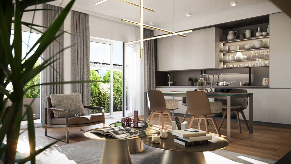 E' composto da un ampio e luminoso living che può essere arredato con una funzionale cucina a vista completa di tavolo da pranzo ed un accogliente e comodo salotto con area tv.