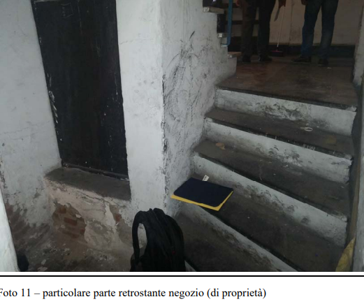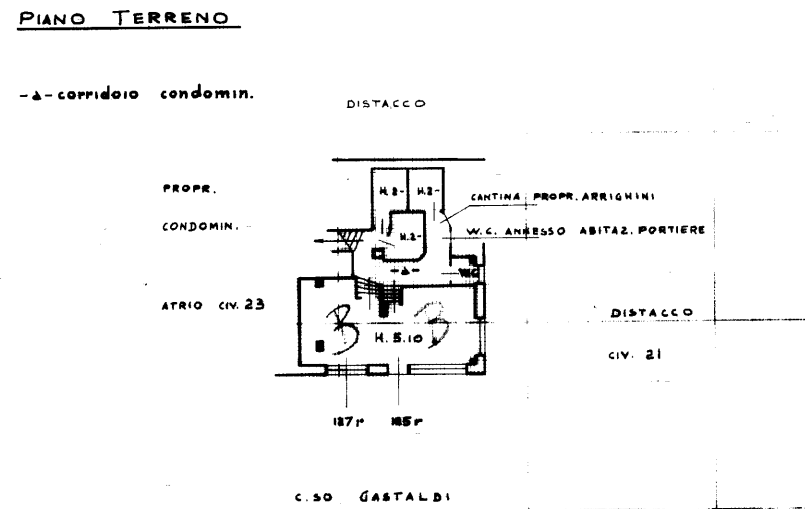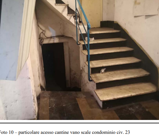 La porzione retro negozio con accesso dal vano scale del condominio di C.so Gastaldi 23 è formata da un locale cantina e da un bagno, il corridoio di proprietà è utilizzato anche dal condominio come servitù, per dare accesso ad un servizio igienico condominiale.
