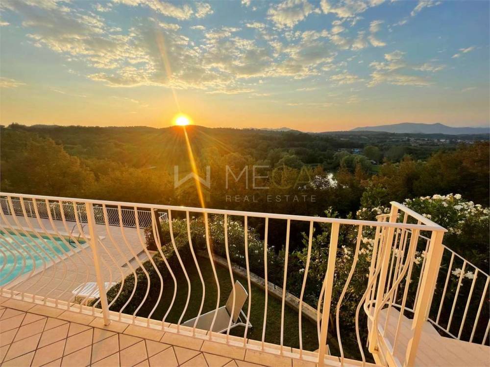 dalla zona giorno si gode di una vista lago eccezionale, in aggiunta è presente un balcone nella zona cucina che permette un bellissimo affaccio sul tramonto, sulle verdi colline circostanti e sul giardino retro, dal quale è possibile accedere al garage ed alla piscina esposta a ovest e molto soleggiata.
