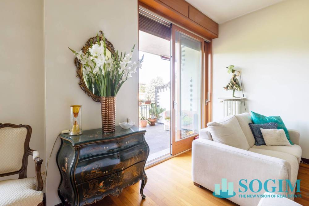 Varcando la soglia, si viene accolti da un grande soggiorno che, grazie alle ampie finestre e allaccesso diretto alla terrazza, regala una splendida luce naturale durante tutto il giorno. La vista è aperta e verde, e trasmette fin da subito una sensazione di tranquillità e riservatezza.
