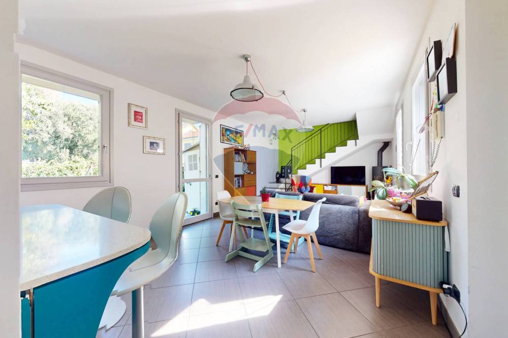 al piano terra, attraversando il primo giardino privato di 20mq, si accede all'ampio soggiorno con angolo cottura con penisola, superato il disimpegno troviamo il primo bagno con doccia e lavatrice;