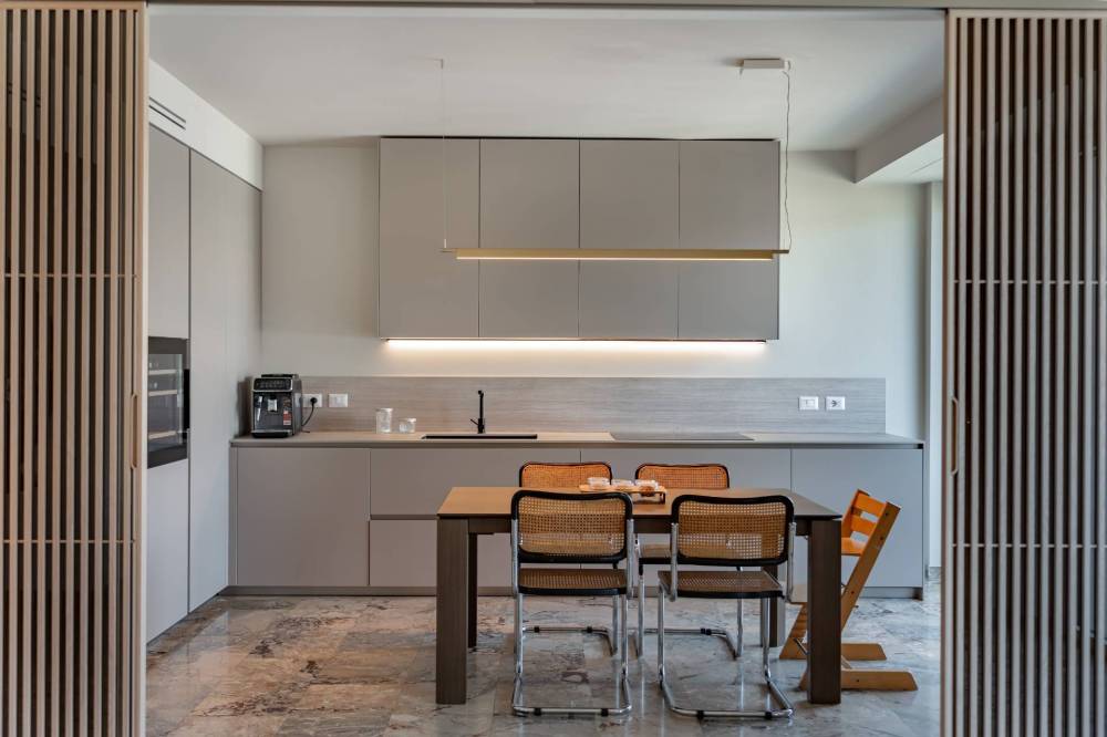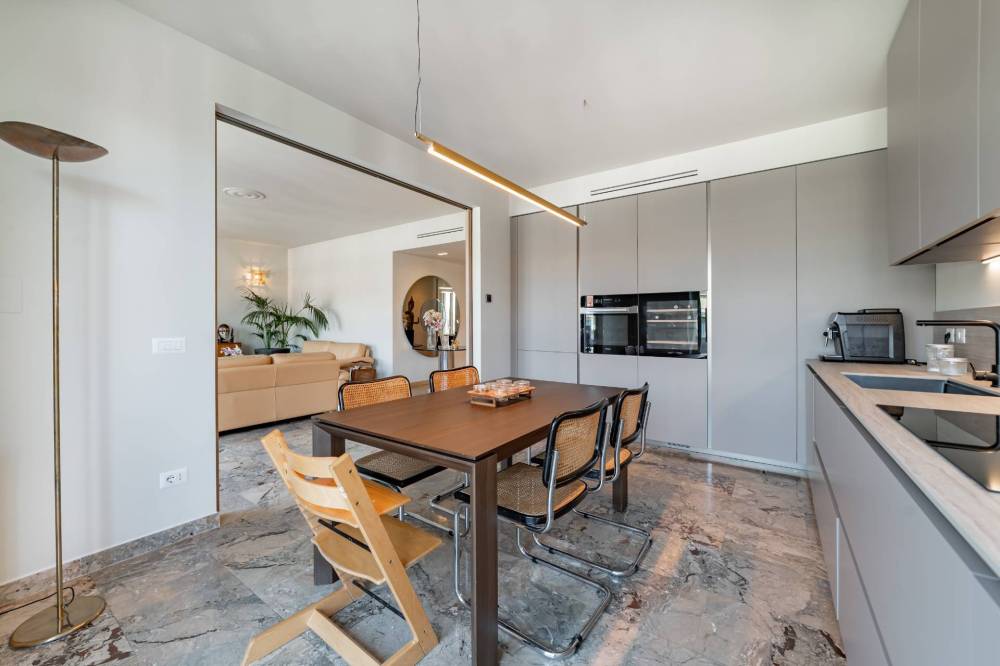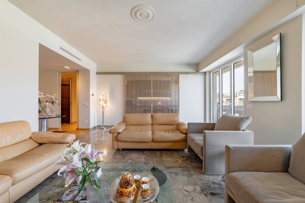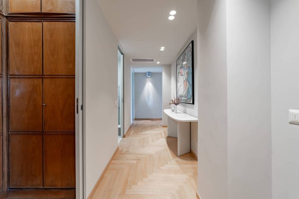 L'immobile proposto è all'ottavo e ultimo piano, internamente l'appartamento, ispirato all'estetica di Frank Lloyd Wright, è sviluppato su un unico piano e presenta una disposizione degli spazi ottimale. Progettato da un'interior designer, è caratterizzato da materiali scelti secondo i principi del "Vastu" e offre un ambiente caldo e accogliente. Si compone di tre camere, tre bagni, due cucine e un ampio balcone. La sicurezza è garantita da porte e galleria chiusa, con un servizio di portineria attivo durante il giorno. La ristrutturazione, realizzata da Tea Costruzione e Design, utilizza materiali di pregio provenienti da uno showroom storico. L'immobile è in classe energetica C, dotato di impianti separati, aria condizionata, pavimenti in parquet di rovere e illuminazione di design. La cucina è firmata Arrital con elettrodomestici Miele e Smeg. La casa è venduta arredata, con possibilità di concordare i mobili da mantenere.